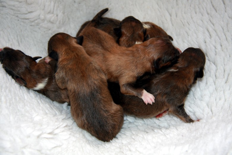 am 02 und 04.02.2012 hielten Angel und Puck Hochzeit Am 08.04.2012 warf Angel 4,2 dark-zobel-weiße Welpen Alle Welpen sind CEA, PRA, KAT-frei Alle Welpen sind vergeben T-Wurf am Tage seiner Geburt Fotos: S. Rosenbohm